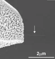 Field emission SEM image of Single Walled Nano Tube bundles grown from a Si cantilever tip assembly