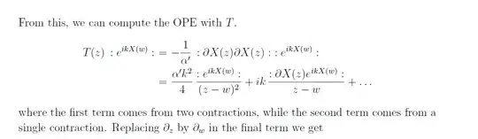 On the top of page 82 in the eq. before eq. (4.27), we are computing the OPE between $T$ and $e^{ikX}$ using Wick's Theorem, it says