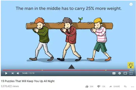 I simplify a bit with placing the two men at the very ends and the middle man at the exact center of the log in line with its center of mass(considering log to have weight $W$). I know I have to find the normal reaction force on the middle man, suppose it to be $R$ and I know by solving moments that the normal reaction for two men on the sides are equal, both equal to suppose $F$. Now even if I solve using both resolving vertically and using moments I end with the same result of : $$2F+R=W$$ Even if I consider the two men at the ends to be not exactly at the ends but at a length $l$ from either side, we get using moments $2Fl+Rl=Wl$ which again ends up as $2F+R=W$.