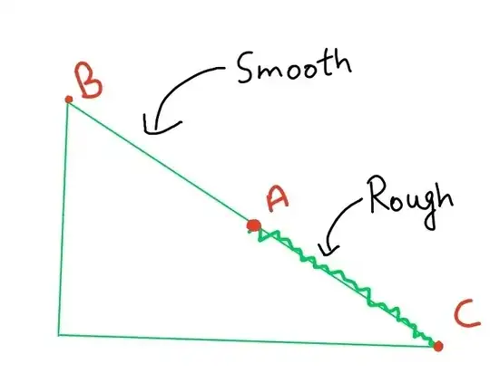 Here, as usual the body will have an increase in its speed while sliding on the frictionless surface from point B to point A. But after point A, the speed will decrease, but angular velocity will increase. This seems to go exactly opposite to $v=R\cdot\omega$. Right? The reason for this is that pure rolling hasn't started yet - it is transitioning, so this formula is not yet applicable. Here, the resistance is doing negative work for translation, which is exactly equal to the positive work on rotation(you may use equations of mechanics to prove this).