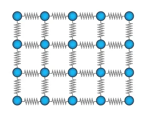 So for the sake of clarity we are going to assume that our model consists of a rectangular grid of identical atoms connected by springs to their upper, lower, left and right atoms each and only. No atom is connected to the atom in the lower left for example and no atom is connected to more than those 4 atoms. Simply said, each atom is connected with springs to the atoms of its von Neumann neighborhood, like in this image: