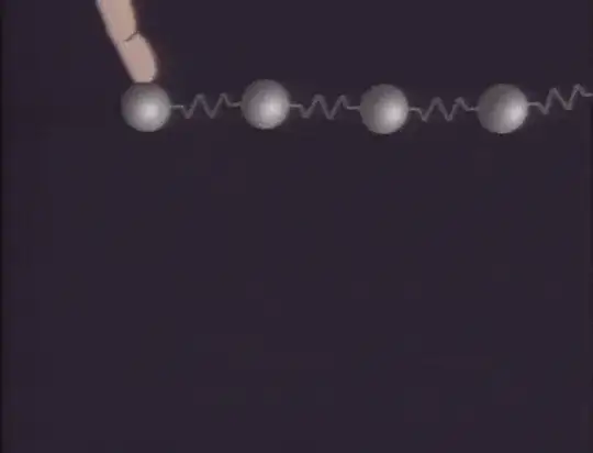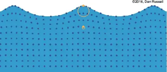 But there is something to note: in the previous animation atoms move up and down only (they might be fixed with a vertical rod, each of them, where they can slide). In our system this is not a limitation, and since $R$ is not only pushed downwards by the displaced $C$ but it is also pushed to the left, the actual wave is a combination of longitudinal and transverse oscillations. The same complex waves that we see in the oceans:
