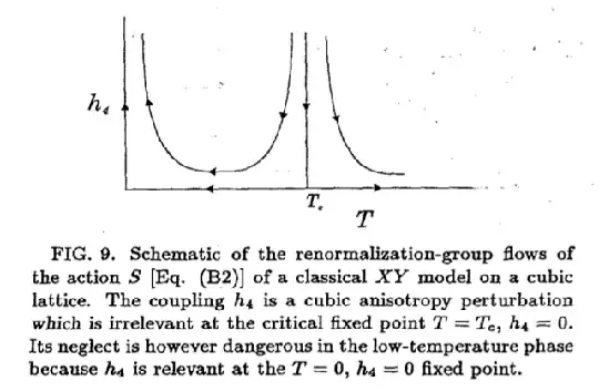 This image is taken from Appendix B, which is partially a very nice review of dangerously irrelevant operators as per your first definition. They are considering a classical 3D XY model in the presence of a ("dangerously irrelevant") term $h_4$ which breaks the O(2) symmetry down to $\mathbb{Z}_4$.