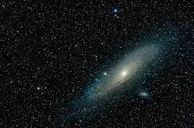 The nearest big galaxy is Andromeda. It is bright enough to see at least part of it. It appears as a fuzzy patch, not a point. It is 200,000 light years across and 2.5 million light years away. That means it is about 3 degrees across if you count all of it, not just the visible part. That is bigger than the sun, though much fainter.