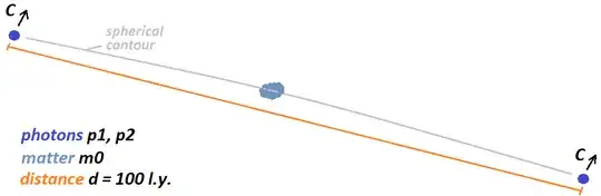 Eventually, $r$ is large enough that mutually closest photons are light years apart. Then, if E-field is, in fact, not mostly zero at that radius - what is transmitting the E-field to matter light-years between the distant photons? Whatever it is, it must be able to influence an arbitrary amount of matter in the 100 light years spanned between the two source carriers (see below) - simultaneously, even if the matter itself is separated by light-years. This implies superluminal speed of information transmission through space, violating relativity.