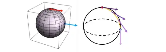 Looking from space, we see, that the two vectors on the left hand side in the picture above point in the same direction (e.g. some fixed star). But for someone on the surface those two vectors are very different because the one at the north pole points forward along the surface, but the one at the equator just points out of the surface. Walking down from the north pole to the equator, the vector field on the right hand side does look way more constant, than the one on the left. If the vector field is a kind of force, say the wind, it would have the same effect on the person every step of the way, namely providing some momentum by tailwind.