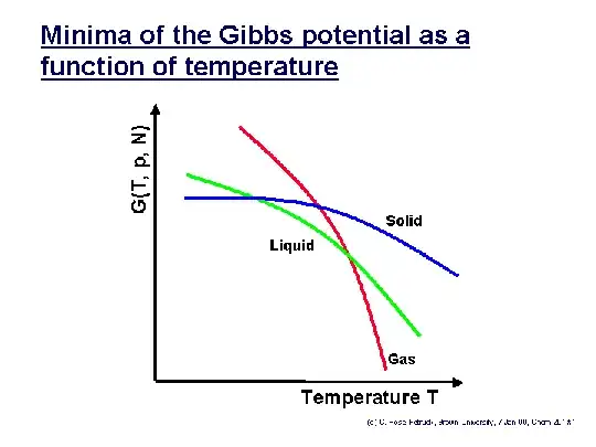 We can also show this effect schematically. Below is a schematic of the chemical potential vs. temperature for solid, liquid, and gas. The slope of each curve is the entropy of that phase (high for gases, low for solids), and the absolute-zero intercept is the enthalpy (slightly higher for liquids than solids because of the poor intermolecular bonding, much higher for gases because of the lack of such bonding). The lowest curve at any given temperature is always the equilibrium phase at that temperature. Note that if the liquid curve is dropped (because the water concentration decreases when you add impurities), the intersection with the pure solid curve moves to a lower temperature, and the intersection with the pure gas curve moves to a higher temperature. This is illustrating the same phenomenon of boiling point elevation and freezing point depression.