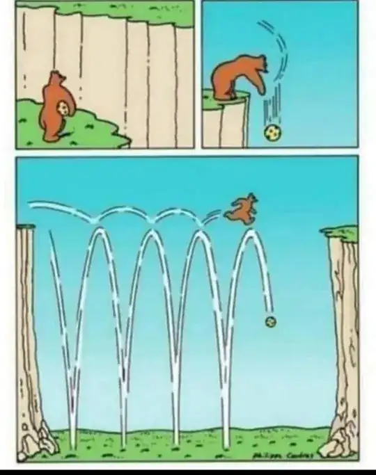 For instance, in order to catch the ball after every bounce, both the bear and the ball must have the same velocity in x, which is already challenging to archive if there is a delay between the bear throwing the ball and jumping from the cliff (as the image suggests) -- if this condition is not met, the bear and the ball will not arrive at the same spot, and the bear will die.