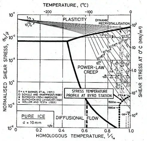 Creep is frequently characterized using a deformation mechanism map, which identifies which creep mechanism (e.g., viscous flow, dislocation creep) predominates under the specific temperature and applied stress and displays the predicted strain rate (e.g., $10^{-10}\,\mathrm{s}^{-1}$, with approximately evenly spaced lines reading $10^{-5}$, $10^{-6}$, $10^{-7}$, and so on indicating an exponential rate decrease with decreasing temperature):