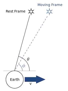 You're all familiar with this effect: suppose that you're standing in the rain, and there's no wind. Since the rain will fall vertically, you have to hold your umbrella straight up. But now start running. What happens? From your point of view, the rain will no longer fall vertically: you have to tilt your umbrella forward to keep your head dry. A similar phenomenon happens with light: the direction in which you see a beam of light depends on your velocity. This effect is called aberration.