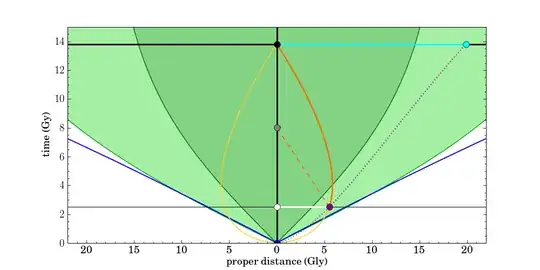 Suppose that we're now observing photons from a distant galaxy. The redshift of those photons allow us to calculate when they were emitted, what the distance of the galaxy was at that time, and what the present-day distance of the galaxy is. In the graph, the galaxy emitted the light when the universe was 2.5 billion years old. The galaxy was located at the purple dot, while our own galaxy was at the white dot, and the distance between both was 5.52 billion lightyears (white line).