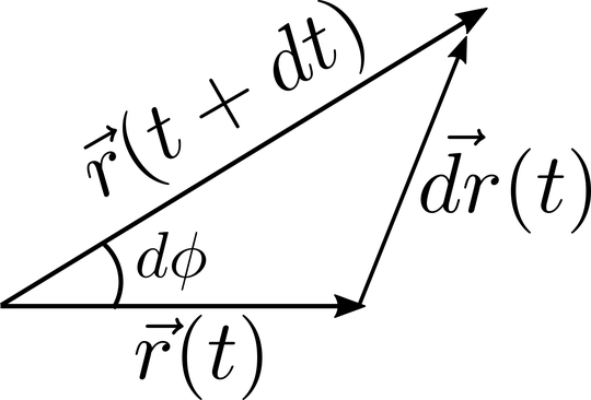 The position vector at time $t$ is $\vec r(t)$, while that at time $t+dt$ is $\vec r(t+dt)$. The linear displacement vector is $\vec {dr}(t) \equiv \vec r(t+dt) - \vec r(t)$. The angular displacement is shown in the figure as $d\phi$. The linear velocity is defined simply as the rate of change of the linear displacement: