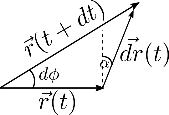 |\vec \omega| = \frac{d\phi}{dt} = \frac{\cos\alpha}{|\vec r(t)|} \frac{|\vec {dr}|}{dt}
