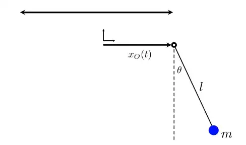 Using the Lagrangian and the Euler-Lagrange-Eqn., I ended up with: $$\ddot{\theta} + \frac{g}{l}\sin{\theta} = -\frac{1}{l}\ddot{x_O}\cos{\theta}$$