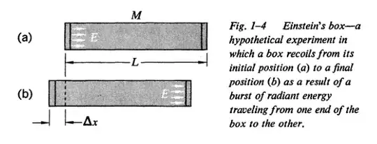 In French, Special Relativity, pg. 16-17, the 'Einstein's box' thought experiment is explained. It starts with a box of length $L$, mass $M$ and we emit photons from one end that have energy $E$. Then it's argued that the box moves opposite to the direction of the photons by an amount $\Delta x = \frac{E L}{M c^2}$. And then, since we suppose it's an isolated system, we say that the center of mass hasn't moved and argue that the photons must have carried some mass $m$ with them. My problem is that I can't make sense of the calculation for this center of mass. Here's the picture from the book.