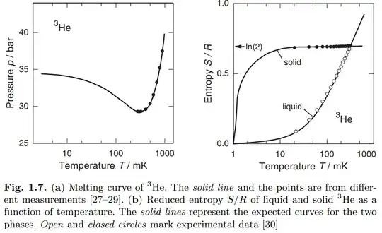 "...the melting curve of ³He...exhibits a pronounced minimum at a temperature of about T = 320 mK. ...we can conclude that the entropy of solid ³He is larger than that of liquid ³He at temperatures below the minimum. ...The essential contribution to the entropy comes from nuclear spins. In the liquid, the entropy varies at low temperatures proportional to T as expected for a Fermi gas... In solid ³He the atoms are strongly localized and the Fermi-gas model is not applicable. At high temperatures the orientation of the localized spins is statistical and their contribution to the entropy is S= = R ln 2, where R is the universal gas constant... With decreasing temperatures a transition to an antiparallel arrangement of the spins is found. The transition temperature to the antiferromagnetic state is 0.9 mK. At T = 0.32 K, the temperature at which the minimum occurs, the entropies of liquid and solid ³He are equal."
