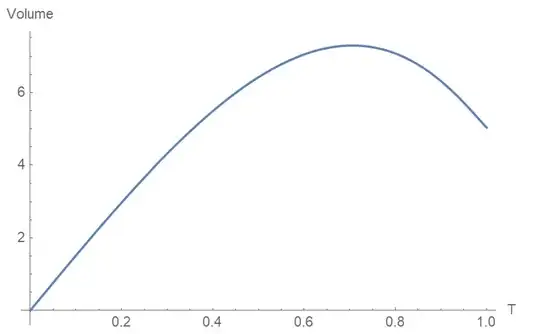 where $r$ is implicitely a function of $X$ and $T$. Of course, at $T=1$ these surfaces will hit the singularity, so I guess this notion of 3-volume would only work for $T$ less than 1. The volume I get by integrating this in Wolfram is