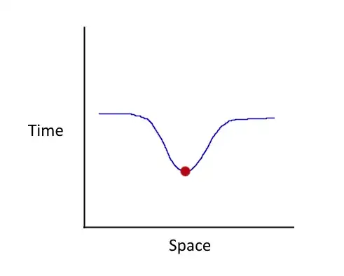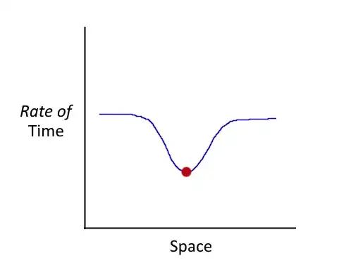 Here we see based on the diagram that the object is "back in time" compared to the surrounding area where the curvature is less dramatic. This statement on its own would seem correct, as we know massive objects slow time, causing the object to "fall behind" in its time compared to less massive objects. However, this whole depiction is not correct-- it can't be correct-- as if it were accurate it would mean one of two things: either the massive object would move "down" in the time dimension relative to the surroundings as the discrepancy between the clocks of the massive object and the surrounding area grew further and further out of sync, causing the spacetime curvature of the massive object to increase over time, or, time won't move at any different rate for the massive object, it will simply be offset or out-of-sync by a certain amount, given by the vertical offset in the graph.