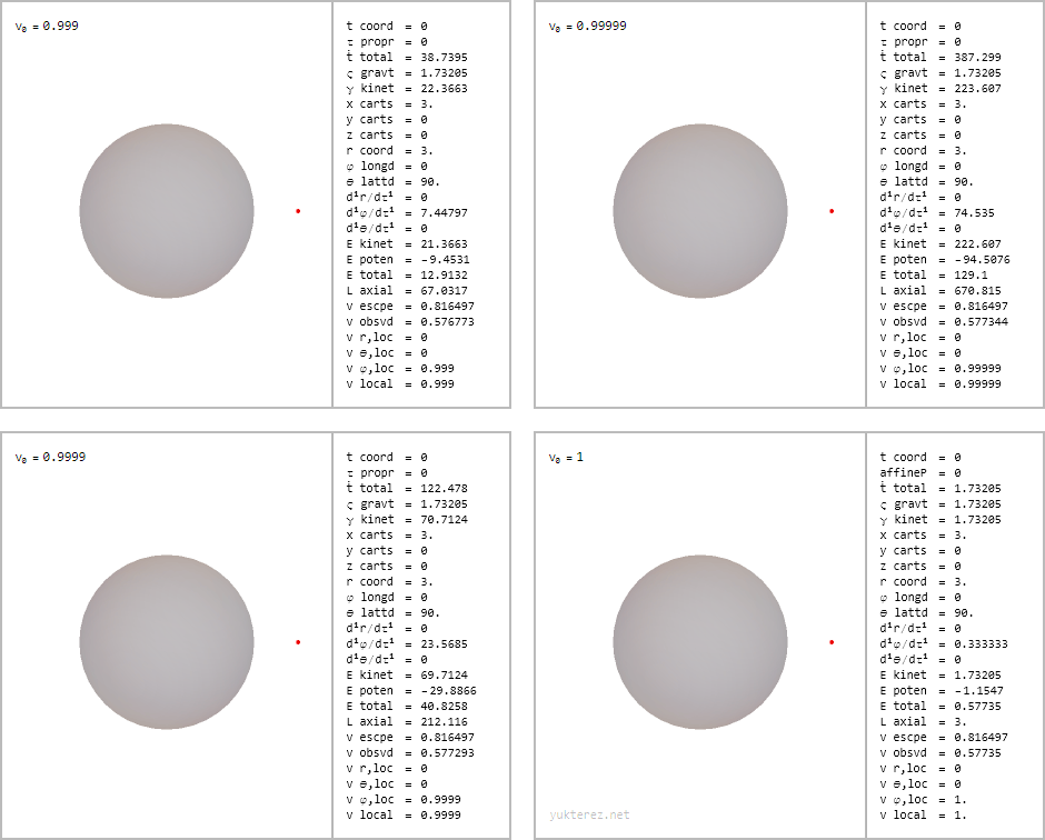 At the end of the simulation the particles that started with v<c also show v=c in the numeric display when they approach r=rₛ, but that is just a rounding artifact since there's only so much space for the 9s after the decimal point.