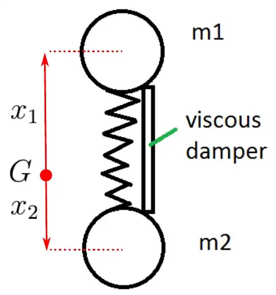 Since $G$ will remain fixed in the absence of external forces, it makes sense to use the coordinates above. The equations of motion of the two particles in these coordinates read $$m_1\frac{\mathrm{d}^2 x_1}{\mathrm{d} t^2} + c \frac{\mathrm{d}l}{\mathrm{d} t} + kl = 0 \\ m_2\frac{\mathrm{d}^2 x_2}{\mathrm{d} t^2} + c \frac{\mathrm{d}l}{\mathrm{d} t} + kl = 0$$ where $l = x_1 + x_2$ (the distance between centers). Multiplying the first equation by $m_1 / (m_1 + m_2)$ and the second one by $m_2 / (m_1 + m_2)$ and adding them we obtain $$\frac{m_1 m_2}{m_1 + m_2}\frac{\mathrm{d}^2 l}{\mathrm{d} t^2} + c \frac{\mathrm{d}l}{\mathrm{d} t} + kl = 0$$ which is of the form of the original equation (the one from Wikipedia) if one takes $$m := \frac{m_1 m_2}{m_1 + m_2}$$