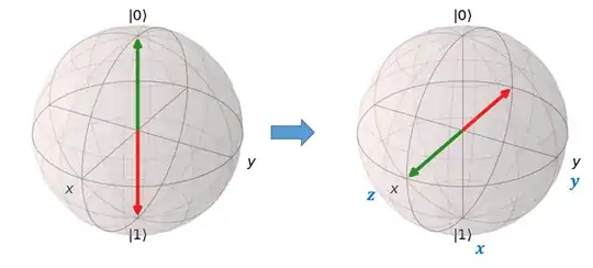 Now, using the RY-Gate, we can construct a matrix using $\frac{\pi}{2}$. This is where my understanding of the mathematical application stops tho, and I can't quite figure out how to do the rest of the calculation. This is as far as I've come, but I can't quite "translate" the result into a comparable qubit state: