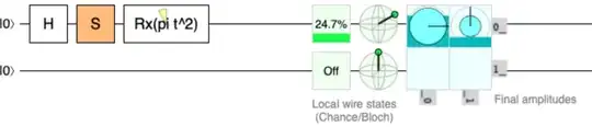 $$\Rightarrow \ Rx(\theta) S \frac{1}{\sqrt{2}}\begin{pmatrix} 1 \\ 1 \end{pmatrix} \ = \ \frac{1}{\sqrt{2}} Rx(\theta) \begin{pmatrix} 1 \\ i \end{pmatrix} \ = \ \frac{1}{\sqrt{2}}\begin{pmatrix} \cos \theta/2 & -i\sin \theta/2 \\ -i\sin \theta/2 & \cos \theta/2 \end{pmatrix} \begin{pmatrix} 1 \\ i \end{pmatrix}$$