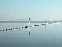 As the lagoon is open to the sea, it has fish such as the gilt-head bream (dorade), the meagre (maigre, a kind of croaker) and the sea bass.[3] The lagoon produces approximately 200 kg/ha/year of fish.[3] However, the shellfish industry is more economically important.[4] Eighteen varieties of shellfish are taken from the lagoon - the most important being oysters. 750 producers farm 2,750 oyster tables and take some 13,000 tonnes annually. This provides for about 8.5% of France's consumption. Oysters from the Étang de Thau are marketed under the name huîtres de Bouzigues (Bouzigues oysters) after the village of Bouzigues where oyster production started. They are a cupped variety.[5] Fixed with cement to ropes, the young oysters are immersed in the water until they reach a size suitable for consumption. Thau water is graded A and so shellfish can be caught and consumed within minutes. In addition to oysters, some 3,000 tonnes of mussels are produced every year.