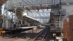 The station consists of two side platforms serving two tracks. The station has three entrances: the south and east entrances adjoining platform 1, and the north entrance adjoining platform 2. Access between the platforms is provided by a footbridge at the west (down) end of the platforms and also be a separate footbridge with lift access. Toilet facilities are provided on both platforms.