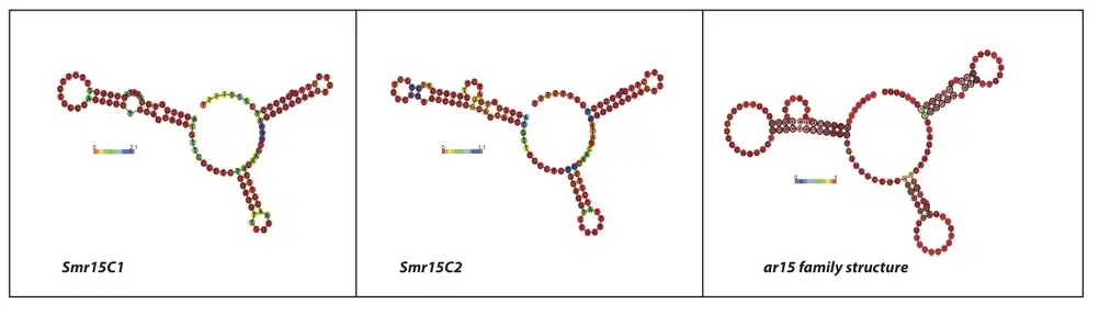 αr15 is a family of bacterial small non-coding RNAs with representatives in a broad group of α-proteobacteria from the order Rhizobiales. The first members of this family (smr15C1 and smrC15C2) were found tandemly arranged in the same intergenic region (IGR) of the Sinorhizobium meliloti 1021 chromosome (C).[1] Further homology and structure conservation analysis have identified full-length Smr15C1 and Smr15C2 homologs in several nitrogen-fixing symbiotic rhizobia (i.e. R. leguminosarum bv. viciae, R. leguminosarum bv. trifolii, R. etli, and several Mesorhizobium species), in the plant pathogens belonging to Agrobacterium species (i.e. A. tumefaciens, A. vitis, A. radiobacter, and Agrobacterium H13) as well as in a broad spectrum of Brucella species (B. ovis, B. canis, B. abortus and B. microtis, and several biovars of B. melitensis). The Smr15C1 (115 nt) and Smr15C2 (121 nt) homologs are also encoded in tandem within the same IGR region of Rhizobium and Agrobacterium species, whereas in Brucella species the αr15C loci are spread in the IGRs of Chromosome I. Moreover, this analysis also identified a third αr15 loci in extrachromosomal replicons of the mentioned nitrogen-fixing α-proteobacteria and in the Chromosome II of Brucella species. αr15 RNA species are 99-121 nt long (Table 1) and share a well defined common secondary structure consisting of three stem loops (Figure 1). The transcripts of the αr15 family can be catalogued as trans-acting sRNAs encoded by independent transcription units with recognizable promoter and transcription termination signatures within intergenic regions (IGRs) of the α-proteobacterial genomes (Figure 5).