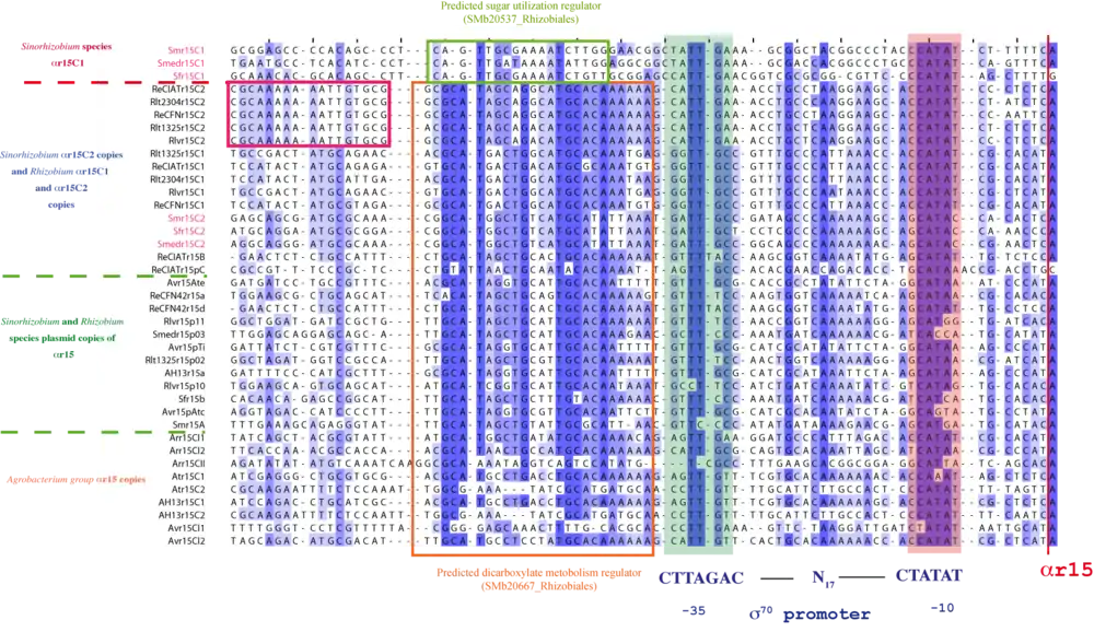 All αr15 loci have recognizable σ70-dependent promoters showing a -35/-10 consensus motif CTTGAC-n17-CTATAT, which has been previously shown to be widely conserved among several other genera in the α-subgroup of proteobacteria.[12] A multiple sequence alignment of these promoter regions revealed a conserved sequence stretch extending up to 80 bp upstream of the transcription start site in all the αr15 loci with the only exceptions of the S. meliloti, S.fredii and S. medicae αr15C1 promoters.