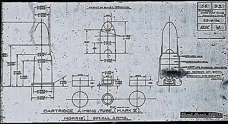 The .297/230 Morris cartridges were produced for use in the Morris Aiming Tube, a commercial sub-calibre barrel inserted into the barrel of a large bore rifle or pistol for training or short range target practice. The Morris Aiming Tube worked well enough for it to be adopted for service in August 1883 by both the British Army and the Royal Navy for use in the Martini-Henry rifle.[1][2][3]