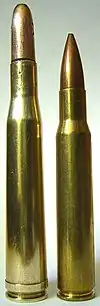 The cartridge offered superior ballistics to the .30-06 for long range, and the .300 H&H is almost as versatile with all bullet weights and types, especially if well-developed handloads are used. It excels with the heaviest .30-calibre bullets in the 180–220-grain range. SAAMI has set the pressure limit for this cartridge at 54,000 P.S.I.[3] Its case length calls for a full-length magnum action, and surplus military actions chambered for the .308 Norma Magnum or the .300 Winchester Magnum offered a lower cost alternative for similar ballistics in the 1960s.[4] The long .300 H&H case was designed for loading cordite, and those two modern magnum cartridges offered similar powder volume in a shorter case better adapted to ballistic uniformity with United States Improved Military Rifle (IMR) smokeless powder.[5]