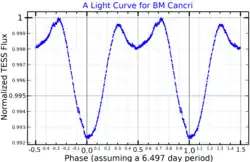 Like all Ap stars, 15 Cancri has a strong magnetic field. This magnetic field varies as it rotates and in 1968 the visual brightness of the star was shown to vary regularly over about four days.[12] 15 Cancri was given the variable star designation BM Cancri in 1972 as a member of the α2 CVn class of variable stars.[13] The period has since been measured more accurately at 3.3095 d, believed to be the rotational period of the star.[14]