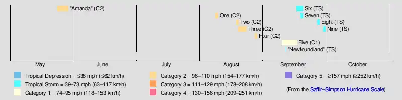 The 1863 Atlantic hurricane season featured five landfalling tropical cyclones. In the absence of modern satellite and other remote-sensing technologies, only storms that affected populated land areas or encountered ships at sea were recorded, so the actual total could be higher. An undercount bias of zero to six tropical cyclones per year between 1851 and 1885 has been estimated.[1] There were seven recorded hurricanes and no major hurricanes, which are Category 3 or higher on the modern day Saffir–Simpson scale.[2] Of the known 1863 cyclones, seven were first documented in 1995 by José Fernández-Partagás and Henry Diaz,[3] while the ninth tropical storm was first documented in 2003.[4] These changes were largely adopted by the National Oceanic and Atmospheric Administration's Atlantic hurricane reanalysis in their updates to the Atlantic hurricane database (HURDAT), with some adjustments.