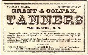 Seymour's campaign was marked by pronounced appeals to racism with repeated attempts to brand General Grant as the "Nigger" candidate and Seymour as the "White Man's" candidate.[9] Grant's antisemitic General Order No. 11 during the Civil War became a campaign issue. He apologized in a letter for the controversial order, stating "I have no prejudice against sect or race, but want each individual to be judged by his own merit. Order No. 11 does not sustain this statement, I admit, but then I do not sustain that order. It would never have been issued if it had not been telegraphed the moment it was penned and without reflection." In his army days he had traded at a local store operated by the Seligman brothers, two Jewish merchants who became Grant's lifelong friends. They became wealthy bankers who donated substantially to Grant's presidential campaign.[10]