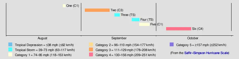 The 1882 Atlantic hurricane season ran through the summer and early fall of 1882. This is the period of each year when most tropical cyclones form in the Atlantic basin. In the 1882 Atlantic season there were two tropical storms, two Category 1 hurricanes, and two major hurricanes (Category 3+). However, in the absence of modern satellite and other remote-sensing technologies, only storms that affected populated land areas or encountered ships at sea were recorded, so the actual total could be higher. An undercount bias of zero to six tropical cyclones per year between 1851 and 1885 and zero to four per year between 1886 and 1910 has been estimated.[1] Of the known 1882 cyclones, Hurricane One and Hurricane Five were both first documented in 1996 by Jose Fernandez-Partagas and Henry Diaz,[2] while Tropical Storm Three was first recognised in 1997.[3] Partagas and Diaz also proposed large changes to the known track of Hurricane Two while further re-analysis, in 2000, led to the peak strengths of both Hurricane Two and Hurricane Six being increased.[3] In 2011 the third storm of the year was downgraded from a hurricane to a tropical storm.[4]