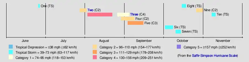 The 1899 Atlantic hurricane season featured the longest-lasting tropical cyclone in the Atlantic basin on record. There were nine tropical storms, of which five became hurricanes. Two of those strengthened into major hurricanes, which are Category 3 or higher on the modern day Saffir–Simpson hurricane wind scale. The first system was initially observed in the northeastern Gulf of Mexico on June 26. The tenth and final system dissipated near Bermuda on November 10. These dates fall within the period with the most tropical cyclone activity in the Atlantic. In post-season analysis, two tropical cyclones that existed in October were added to HURDAT – the official Atlantic hurricane database. At one point during the season, September 3 through the following day, a set of three tropical cyclones existed simultaneously.