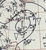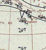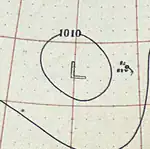 The hurricane turned northeastward on September 12 and began to accelerate. Early on September 13, it passed very close to Bermuda, with a minimum barometric pressure of 939 mbar (27.7 inHg) observed on the island.[2] Cedar trees were uprooted, while fruit and ornamental trees were swept out to sea. Some houses were destroyed, while others were deroofed. Severe damage was also reported at the naval yard and colonial government buildings. At Her Majesty's Dockyard alone, damage was "at least five figures".[10] Early on September 14, the storm weakened to a Category 2 hurricane, then to a Category 1 several hours later. Shortly after 0000 UTC on September 15, the hurricane struck the Avalon Peninsula of Newfoundland with winds of 85 mph (137 km/h). It soon became extratropical.[2] In Newfoundland, severe damage was reported at fishing premises.[10] The schooners Angler, Daisy, and Lily May either capsized or were driven ashore, resulting in 16 deaths.[11]