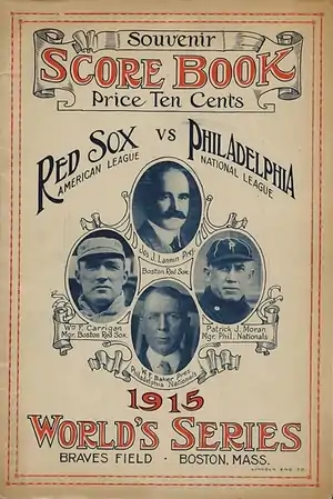 The 1915 World Series was the championship series in Major League Baseball for the 1915 season. The 12th edition of the World Series, it matched the American League champion Boston Red Sox against the National League champion Philadelphia Phillies. The Red Sox won the Series four games to one. It was the last World Series to start on a Friday until the 2022 World Series.[1]
