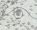 Based on historical weather maps, a weak trough developed into a tropical depression about 215 mi (345 km) northeast of Bermuda around 00:00 UTC on November 3.[2][8] The cyclone initially moved northeastward and reached tropical storm intensity around 18:00 UTC.[8] On November 4, the system attained its peak intensity with maximum sustained winds of 45 mph (75 km/h) and a minimum barometric pressure of 1,001 mbar (29.6 inHg), the latter being observed by a ship.[2] The storm curved southeastward late on November 4 and then southwestward about 24 hours later. Late on November 6, the system turned to the west. On the following day as the cyclone began turning south-southwestward,[8] a weather station on Bermuda observed sustained winds of 40 mph (64 km/h).[2] The storm weakened to a tropical depression early on November 9 and began to execute a cyclonic loop. Around 12:00 UTC on November 10, it re-intensified into a tropical storm. The storm completed its cyclonic loop by November 12 and resumed moving south-southwestward. Around 06:00 UTC on November 13, the cyclone fell below tropical storm intensity again and dissipated early on November 14 while located about 300 mi (485 km) south-southeast of Bermuda.[8]