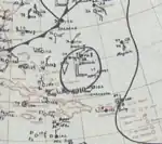 The origin of this hurricane is uncertain, though it is believed to have coalesced into a tropical depression over the central Caribbean Sea on September 23.[20] The disturbance gradually organized as it moved to the west, and strengthened to tropical storm intensity less than a day after formation and further to a hurricane by September 25. The cyclone subsequently curved northward from its initial westward motion. On September 27, the storm reached major hurricane intensity before making landfall near Cienfuegos, Cuba, as a Category 3 hurricane the next day.[8][20] After passing the island, the system reintensified and peaked with a minimum barometric pressure below 945 mbar (hPa; 27.91 inHg)[nb 3] and maximum sustained winds of 140 mph (220 km/h), making it a Category 4 hurricane. At the same time, the tropical cyclone passed over the Bahamian island of Bimini before moving out to sea. As it progressed northeastward, the hurricane gradually weakened before transitioning into an extratropical storm on October 2. The extratropical remnants traversed Newfoundland before dissipating later that day.[8][20]