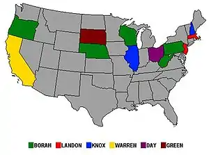 The 1936 Republican National Convention was held in Cleveland, Ohio, between June 9 and 12. Although many candidates sought the Republican nomination, only two, Governor Landon and Senator William Borah from Idaho, were considered to be serious candidates. While County Attorney Earl Warren from California, Governor Warren Green of South Dakota, and Stephen A. Day from Ohio won their respective primaries, the seventy-year-old Borah, a well-known progressive and "insurgent," won the Wisconsin, Nebraska, Pennsylvania, West Virginia, and Oregon primaries, while also performing quite strongly in Knox's Illinois and Green's South Dakota.[4] The party machinery, however, almost uniformly backed Landon, a wealthy businessman and centrist, who won primaries in Massachusetts and New Jersey and dominated in the caucuses and at state party conventions.