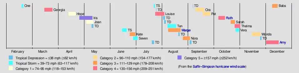 The season began with the formation of a short-lived unnamed tropical storm on February 19, well east of the Philippines; Typhoon Georgia became the season's first named storm and typhoon after first developing in the open Pacific on March 20. In April, Typhoon Iris developed before intensifying into a super typhoon the following month; Iris was the first recorded instance of a Category 5-equivalent typhoon in the western Pacific. The final typhoon and storm of the year was Typhoon Babs, which remained at sea before dissipating on December 17.
