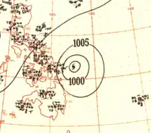 In late April, a well-developed tropical wave began developing east of Chuuk Lagoon.[9] Tracking westward, the easterly wave was analyzed to have organized into a tropical depression by 0000 UTC on April 29.[10] Twelve hours later, Iris was estimated to have strengthened into a tropical storm.[11] At roughly the same time, a vessel in the vicinity of the storm reported winds in excess of 65 km/h (40 mph), prompting the Guam Fleet Weather Center to initiate reconnaissance flights into the cyclone.[7] Midday on April 30, Iris intensified into the equivalent of a modern-day typhoon as it moved in a slightly oscillatory path towards the Philippines.[7][11] After a slight fluctuation in intensity during the overnight hours of May 1, Iris rapidly intensified to reach its peak intensity with a minimum pressure of 909 mbar (909 hPa; 26.8 inHg) and maximum sustained winds of 280 km/h (170 mph) early on May 4,[11] making it the equivalent of a Category 5 super typhoon;[10] at the time this was the first confirmed instance of a typhoon reaching such intensities.[2] Afterwards, Iris weakened slightly before making landfall on South Luzon around 1800 UTC the following day.[11]