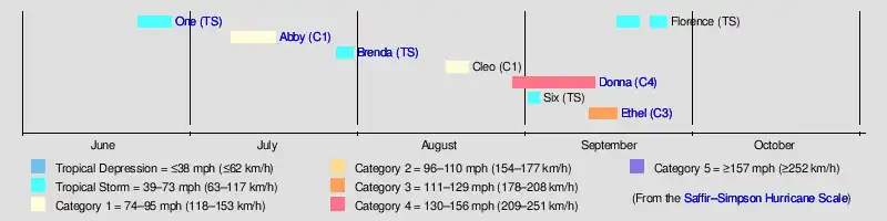 Season activity began on June 23, with the development of an unnamed tropical storm. Tropical cyclogenesis resumed in July with Hurricane Abby between July 10 and July 16, followed by Tropical Storm Brenda from July 28 to July 31. In mid-August, Hurricane Cleo developed and had an uneventful duration. At the end of that month, Hurricane Donna formed and lasted into mid-September; it was the strongest tropical cyclone of the season, peaking as a Category 4 hurricane. There was a Category 3 hurricane in September, Ethel, which briefly existed in the Gulf of Mexico. The last storm of the season, Tropical Storm Florence, dissipated on September 25, over a month before the official end of the season on November 15.[2][4]