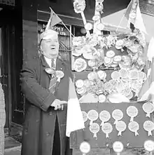 Vendor at Heuston Station in 1969, selling rosettes for Kerry, Offaly, Derry and Cork (the latter meeting in the minor final)