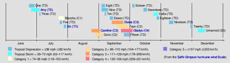 Tropical cyclogenesis began in June, with the development of a tropical depression on June 24, followed by Tropical Storm Amy on June 27. Four systems originated in July, including Hurricane Blanche. After Tropical Depression Six dissipated on July 30, tropical activity went dormant for over three weeks, ending with the development of Hurricane Caroline on August 24. Another cyclone, Hurricane Doris, also formed in August. September was the most active month of the season, featuring eight tropical cyclones, including hurricanes Eloise, Faye, and Gladys. In October, four systems formed, one of which intensified into Tropical Storm Hallie. Two tropical depressions developed in November. The last system, a subtropical storm, formed on December 6 and transitioned into an extratropical cyclone on December 13.[3]