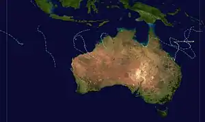 Jane formed on January 2, 1983, near Indonesia. The storm moved southward where it reached Category 1 status on the same day. Jane did a small loop before continuing south-eastward. Jane reached Category 4 status before making landfall east of Port Hedland, Western Australia. Jane then dissipated after January 10.[1]