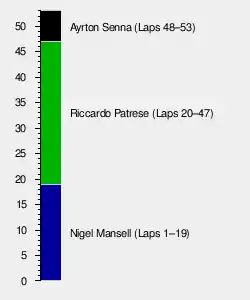 At the start Mansell took the lead ahead of Senna who just managed to stay ahead of Alesi then Patrese and Capelli. Schumacher had a poor start selecting a wrong gear and then hit a Ligier from behind at the first chicane. He had to pit to replace the nose and front wing at the end of the first lap. Patrese managed to overtake Alesi at the start of lap 2. The opening laps saw both Berger and Schumacher recovering many positions from the back of the field and overtaking a number of slower cars.