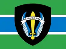 All members of the brigade wear the unit insignia depicting a winged sword, representative of the "deadly, silent and swift" nature of special forces operations.[18] A scroll runs across the sword and wings with the motto "Who Dares Wins" (Ο ΤΟΛΜΩΝ ΝΙΚΑ), a tribute to the Free Greek Special Forces that served with the 1 SAS Brigade during World War II.[18] The unit flash is emblazoned with ΔΥΝΑΜΕΙΣ ΚΑΤΑΔΡΟΜΩΝ ('Raider Forces'). While on operations, low-visibility patches are worn.[18]